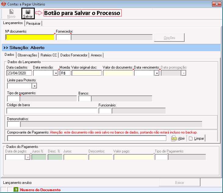 Imagem 3: Contas a PagarNão existe segredo para realizar um Lançamento Unitário no processo de Contas a Pagar, pois se trata mais do preenchimento dos campos considerados Obrigatórios, conforme Imagem 3. Abaixo está a explicação de cada campo.