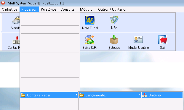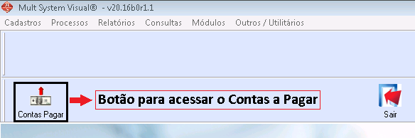 Imagem 2: Contas a PagarAo acessar o processo do Contas a Pagar através dos caminhos informados nas Imagens 1 e 2, o sistema irá carregar a tela de Lançamento Unitário (Imagem 3), ou seja, onde é possível que o Usuário realize lançamentos manualmente.