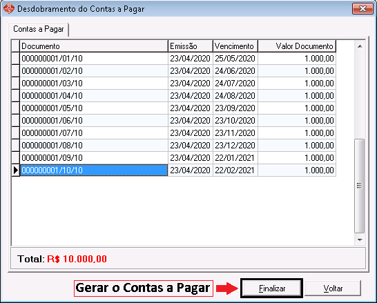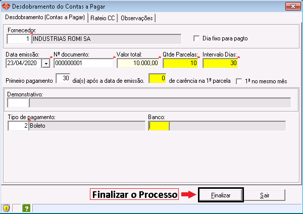Em seguida, o sistema vai mostrar um demonstrativo de como os documentos ficaram no Contas a Pagar, é possível alterar os dados conforme necessário, caso estiver tudo certo é só o Usuário clicar em Finalizar, botão marcado na Imagem 7.