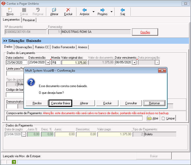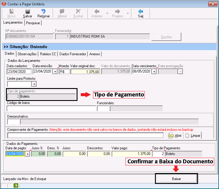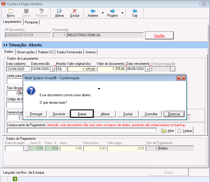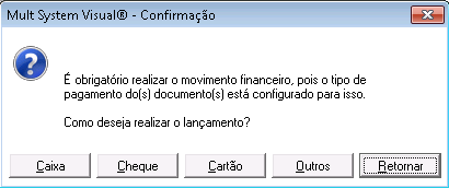 Imagem 12: Baixa de DocumentoSe o tipo de pagamento (Imagem 12) estiver configurado para fazer Movimentação Financeira, o sistema vai fazer mais uma pergunta (Imagem 13):