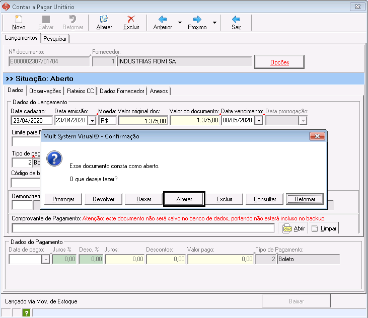 Através do Lançamento Unitário o Usuário também pode realizar a Baixa de um documento, basta que o Usuário pesquise o documento e clicar 2 vezes para que o sistema abra o documento, ao abrir o documento o sistema irá realizar uma pergunta ao Usuário como mostra na Imagem 11.