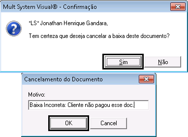 Imagem 17: Cancelamento de BaixaApós clicar em Cancelar Baixa o sistema irá pedir a confirmação do cancelamento, ao responder o sistema irá abrir uma caixa de diálogo onde o Usuário irá informar o Motivo do Cancelamento, conforme Imagem 18.