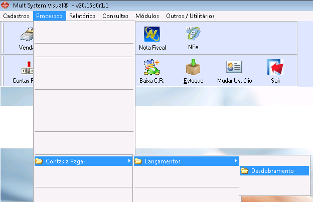 Caso necessário o Usuário pode realizar o Lançamento de vários Documentos ao mesmo tempo, por exemplo, no caso de um Contrato de Longo Prazo com valor mensal fixo, esse Contrato pode ser lançado no Contas a Pagar através do Desdobramento que fica no Caminho conforme Imagem 5.